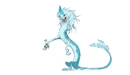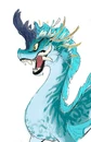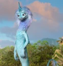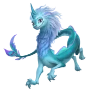 Sisu is a long spindly looking dragon. She is blue in color with a darker shade on her back and a lighter shade on her stomach, arms, and face. She has short dorsal fins on her back and possesses white-bluish-violet hair as a mane and a small tuft of her at the end of her tail. She has two dark blue horns with swirls on top of her head and has a snout with human looking teeth. Additionally, Sisu has big purple eyes. She has two horns at the top of her head, patterned with an intricate design.