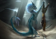 Joining Tuk Tuk, a chase begins and ends when Raya has the idea of submerging her mount in the water because Fang's felines hate water. The trio then boards The Shrimporium, a restaurant boat run by an eccentric young boy named Boun, who serves as both cook and captain. Raya pays the kid to take them to Talon but seeing the slow movement of the boat, Sisu jumps into the water, regains her true form and clings to the hull before using her tail to quickly move the boat, narrowly escaping Namaari and her minions. After the escape, Sisu swims peacefully in the water, surrounded by seaweed and fish. When she rises to the surface, the wrist strap is told by Raya not to show herself in her true form in the presence of someone else, although Sisu doesn't see the problem until Raya implied that people would do anything to capture her. Sisu relents and resumes her human form after sarcastically noting that Raya should learn to trust. Boun then serves food for the duo but before Sisu starts tasting, Raya's paranoid suggests that the food is stocked. Sisu eats it anyway before burning her throat with the dynamic sauce[2].